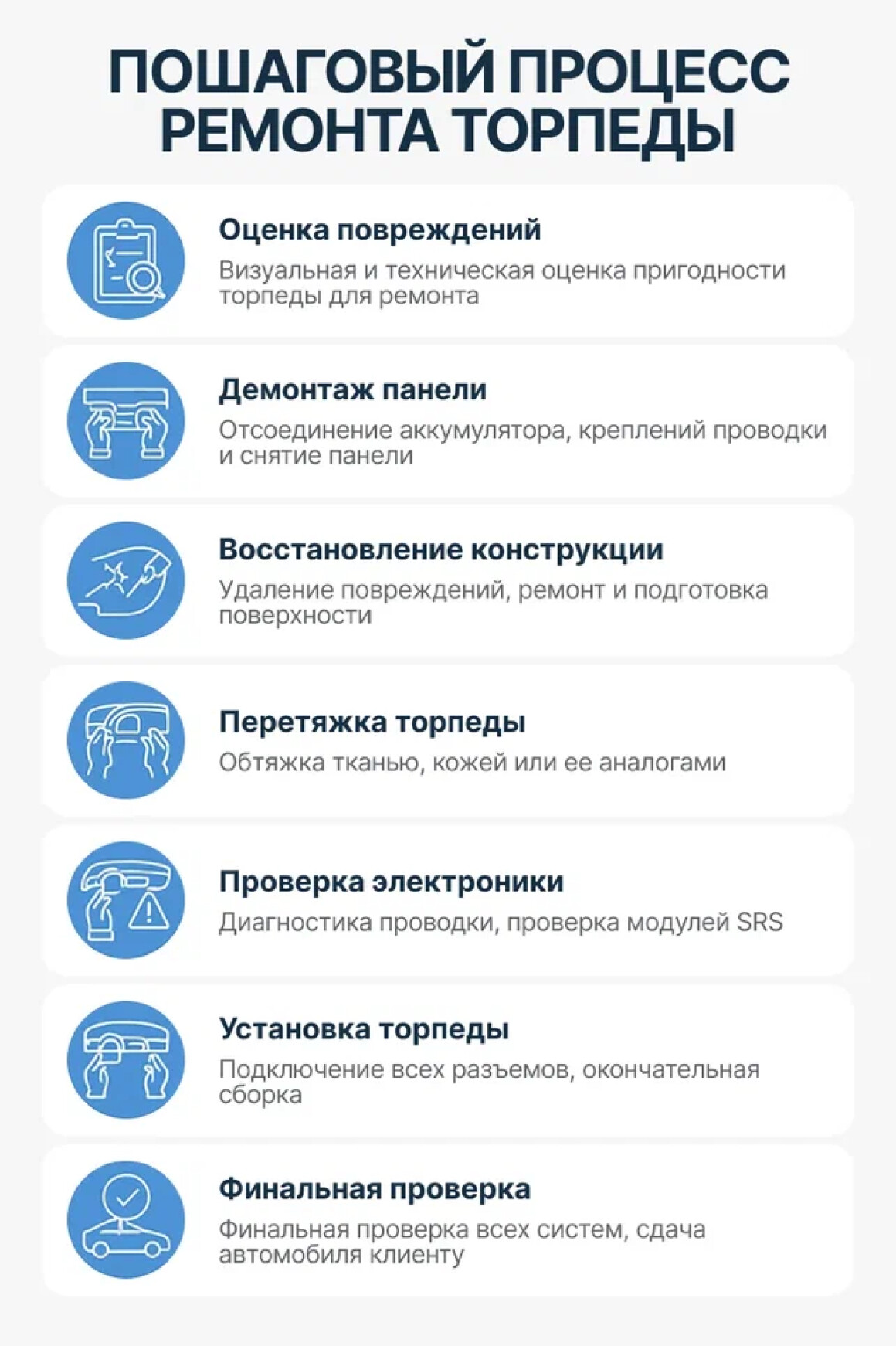 Этап 2. Демонтаж панелиДля качественного ремонта торпеду необходимо полностью демонтировать. Это включает: