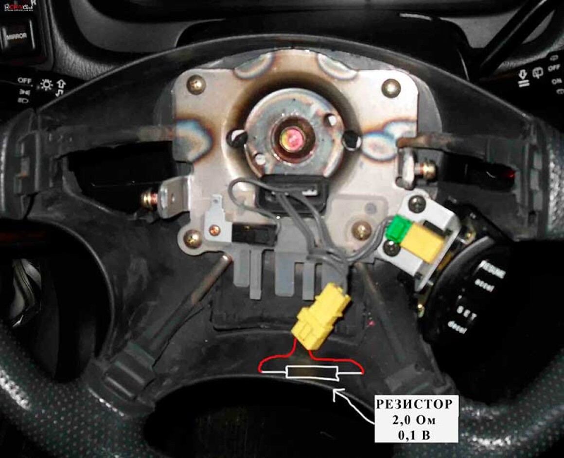 3. При необходимости подключают резистор (обманку), чтобы блок SRS "думал", что подушка присутствует.